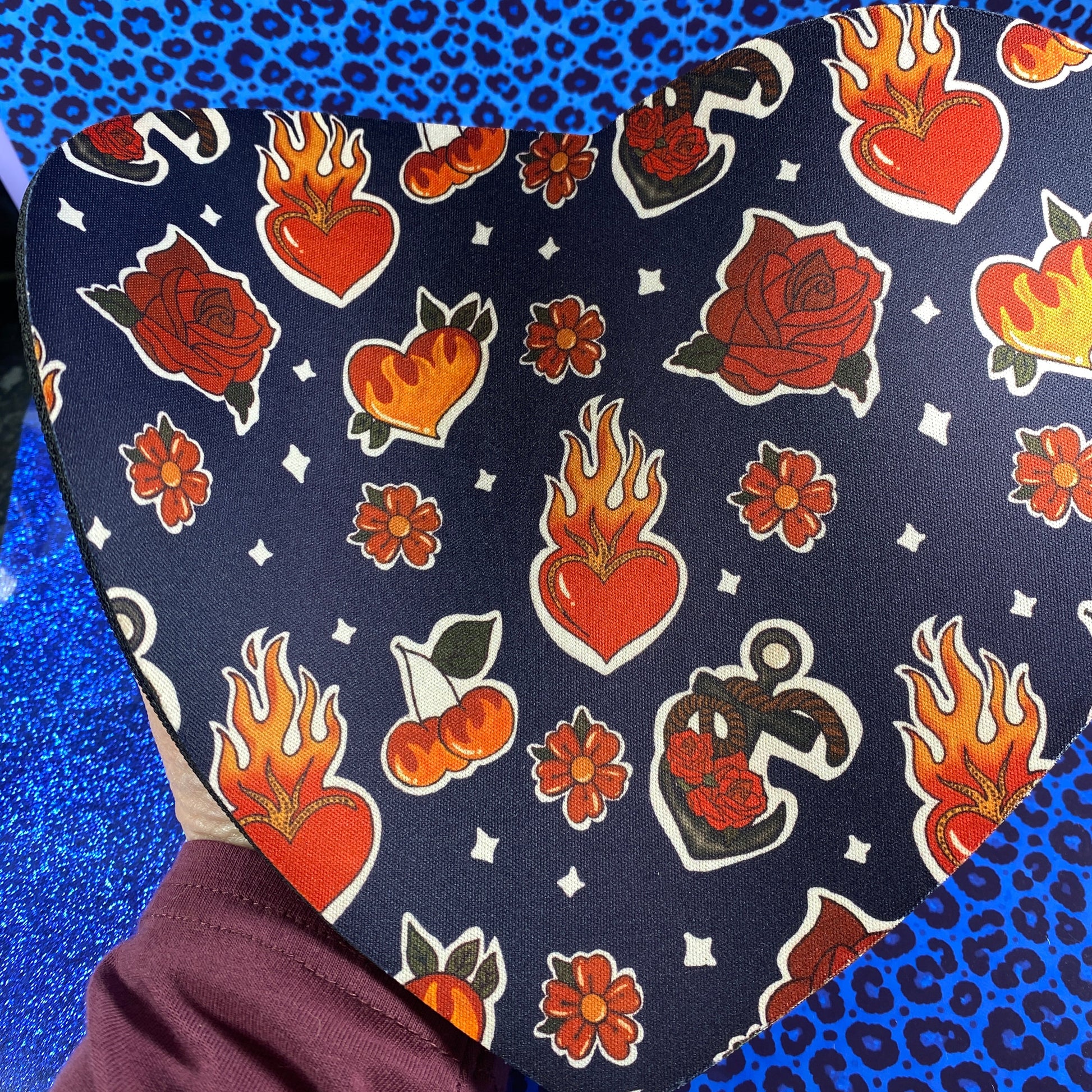 Featuring a deep navy blue background with fiery hearts and floral motifs, this mousepad combines style and functionality, making every click and movement more inspiring.